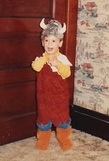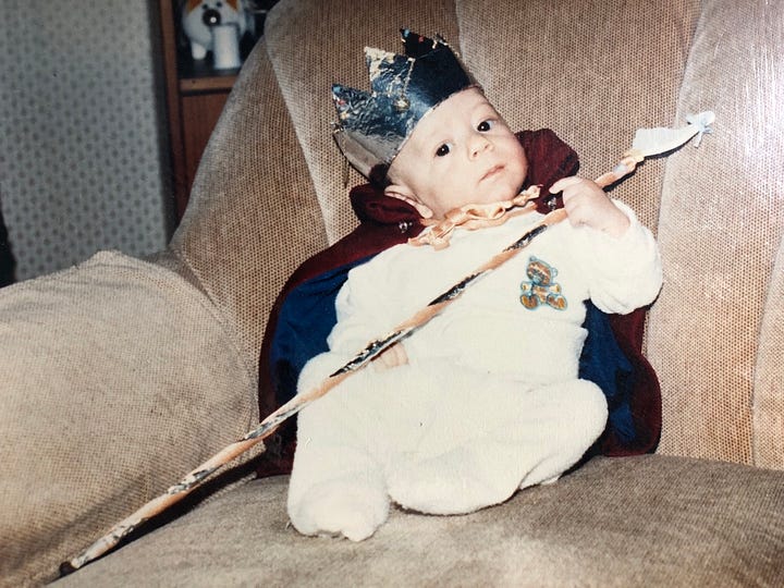 At ten weeks old, Matthew ruled the roost, so for his first Halloween, I made him a king. I was still nursing, so I dressed as a cow.