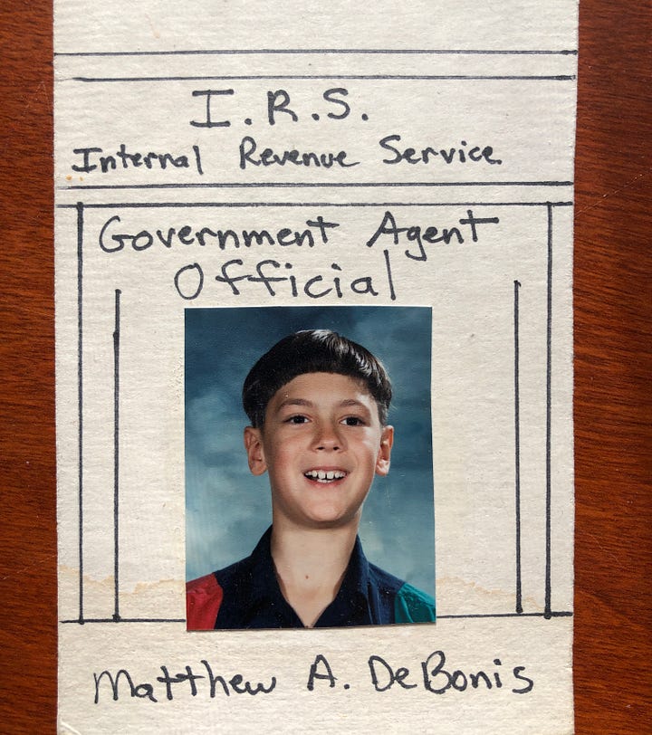 Matthew came up with the idea of being an IRS agent. The sign hidden behind his trench coat says: “IRS. You owe me candy.”